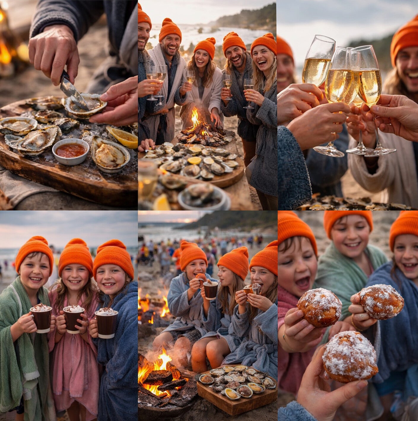 Strand vol energie. Oranje mutsen in de lucht. Gelach, lef, saamhorigheid en kippenvelmomenten bij de branding.